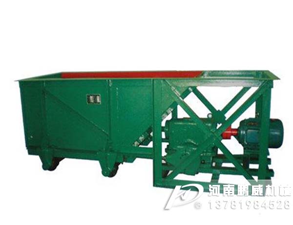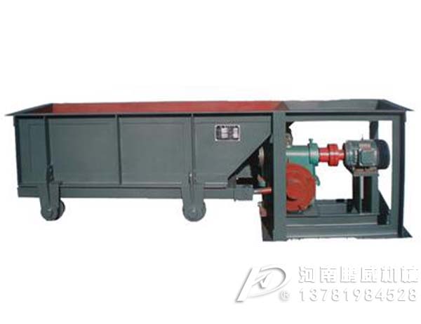 槽式給料機又稱往復式或擺動式給料機,它是貯礦槽排料應用較早的一種給料設備。型式較多,其結構的共同點是均裝有可控制料層高度的調節閘板;在輸料槽下部為一前后移動的給料板。其不同點是給料板角度不一樣,一般為沿卸料方向向下傾斜5度以及更大的傾角(小于物料的靜堆積角)和角度為零的水平型等。給料板的動作有前后往復移動式,抖動式以及擺動式等。傳動機構均為曲柄回轉式。
